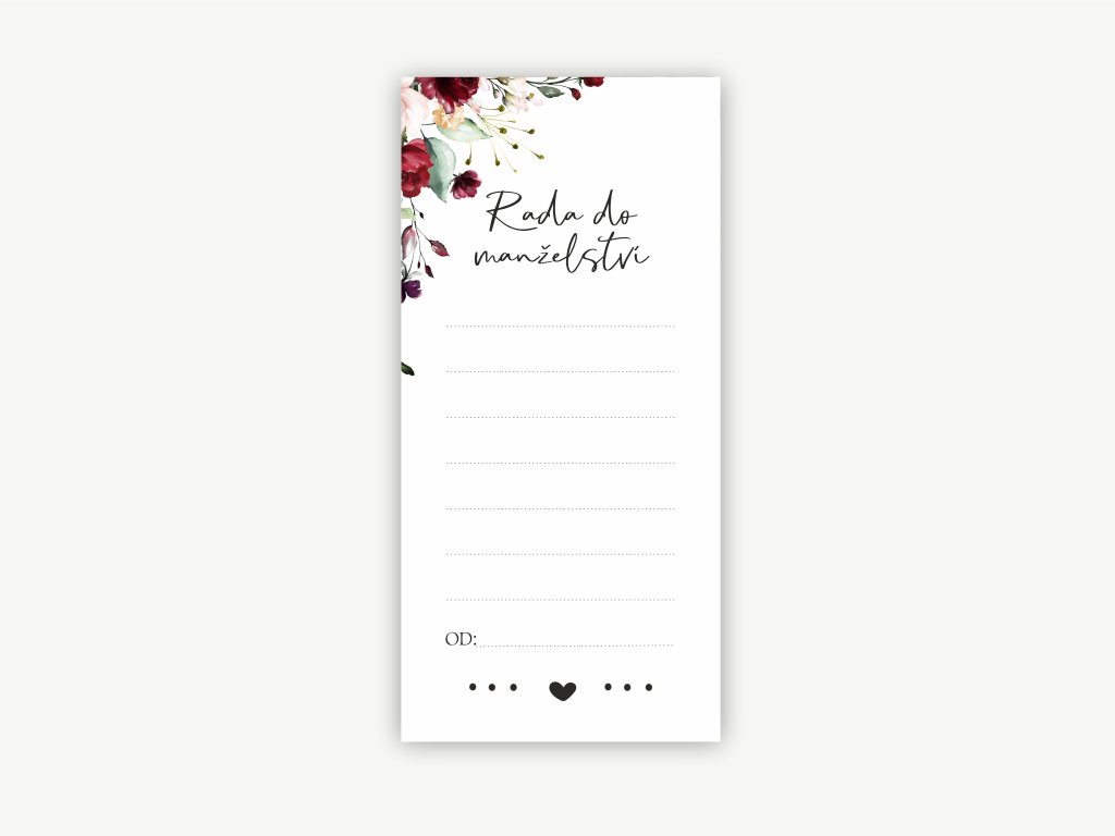 Produkt „Rada do manželství“ od ZuzaDesign je elegantní a hravý doplněk pro každou svatbu. Tyto kartičky umožňují hostům sdílet své rady, přání nebo vtipné postřehy pro novomanžele, čímž přispívají k nezapomenutelné atmosféře svatebního dne.