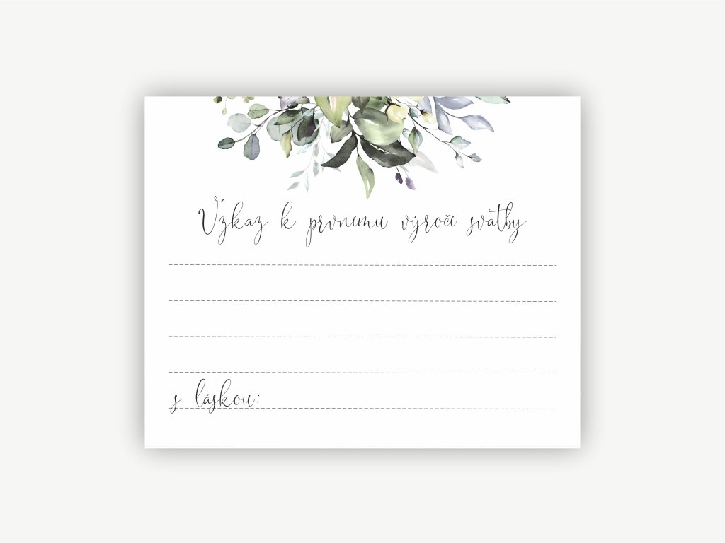 Kartička „Vzkaz k prvnímu výročí“ je drobný, ale velmi osobní detail svatebního dne. Dává hostům prostor napsat přání, radu nebo milou myšlenku, ke které se novomanželé vrátí až po roce společného života. Právě tento časový odstup dává vzkazům jedinečný význam a promění je v krásnou vzpomínku.
