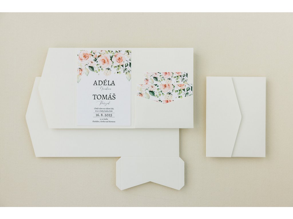 Na fotografii je ilustrativně jak obálka vypadá s oznámením a dalšími doplňky, které lze zakoupit v jednotném designu, který si u nás vyberete.